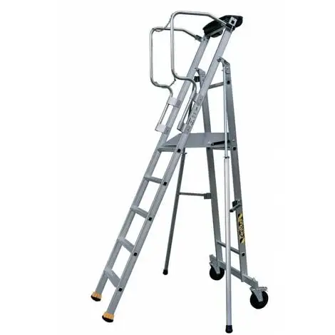 Equipées de stabilisateurs à réglage millimétrique, les plates-formes en aluminium garantissent un accès sécurisé aux rayonnages, racks de stockage et machines. L’accès au plancher se fait par de larges antidérapantes de 80 mm de largeur, assemblées par sertissage sur les modèles 4 à 9 marches et par soudage à partir du 10 marches.