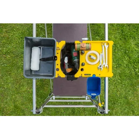 La tablette porte-outils Tools Up est compatible avec tous les échafaudages avec un garde-corps avec une largeur comprise entre 51 et 65 cm. Innovante et ergonomique, la tablette Tools’Up vous permettra de ranger un grand nombre d’outils grâce à ses deux grands plateaux. Elle est composée d’une bandoulière afin de la transporter à l’épaule et ainsi de monter et descendre tous ses outils sans problème.